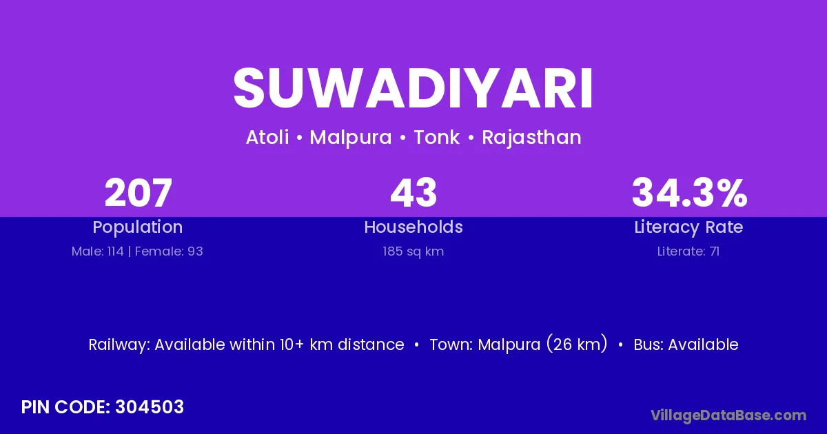 Malpura (26 km) is the nearest town to Suwadiyari village for major economic activities and is located approximately 26 km away.
