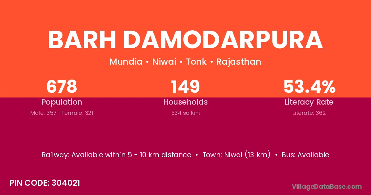 Niwai (13 km) is the nearest town to Barh Damodarpura village for major economic activities and is located approximately 13 km away.