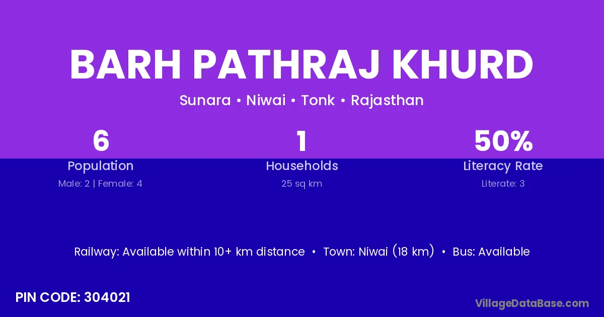 Niwai (18 km) is the nearest town to Barh Pathraj Khurd village for major economic activities and is located approximately 18 km away.