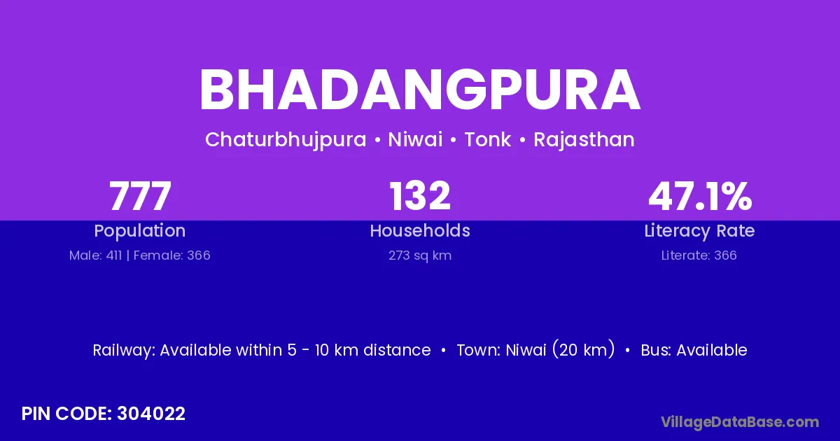 Niwai (20 km) is the nearest town to Bhadangpura village for major economic activities and is located approximately 20 km away.