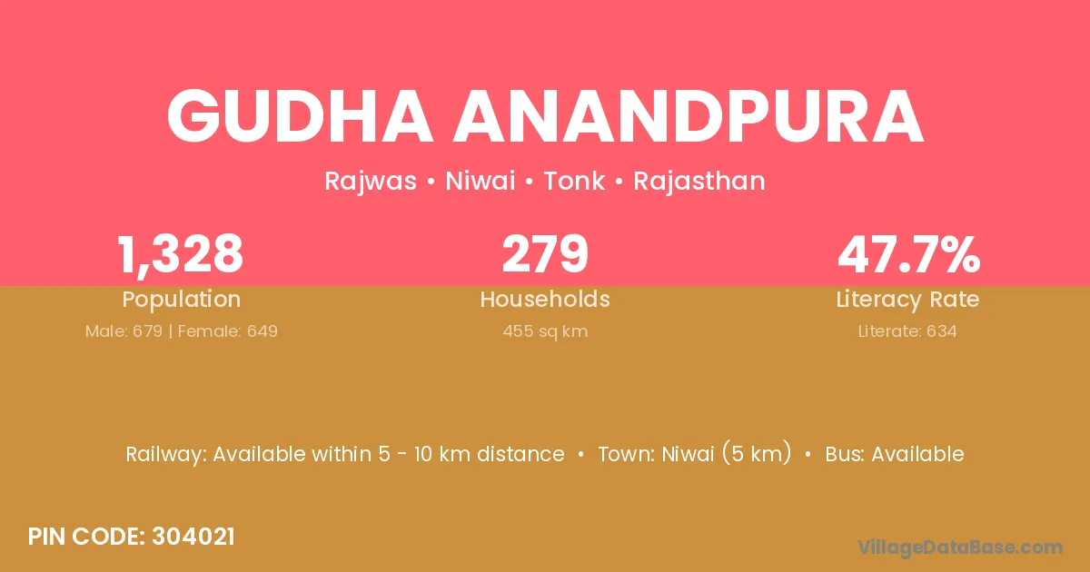 Gudha Anandpura village has a total population of 1,328 people, of which 679 are males and 649 are females.