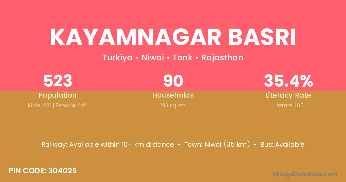 Niwai (35 km) is the nearest town to Kayamnagar Basri village for major economic activities and is located approximately 35 km away.