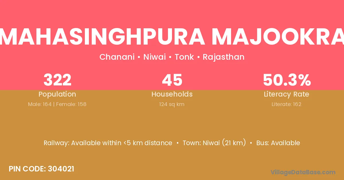 Niwai (21 km) is the nearest town to Mahasinghpura Majookra village for major economic activities and is located approximately 21 km away.