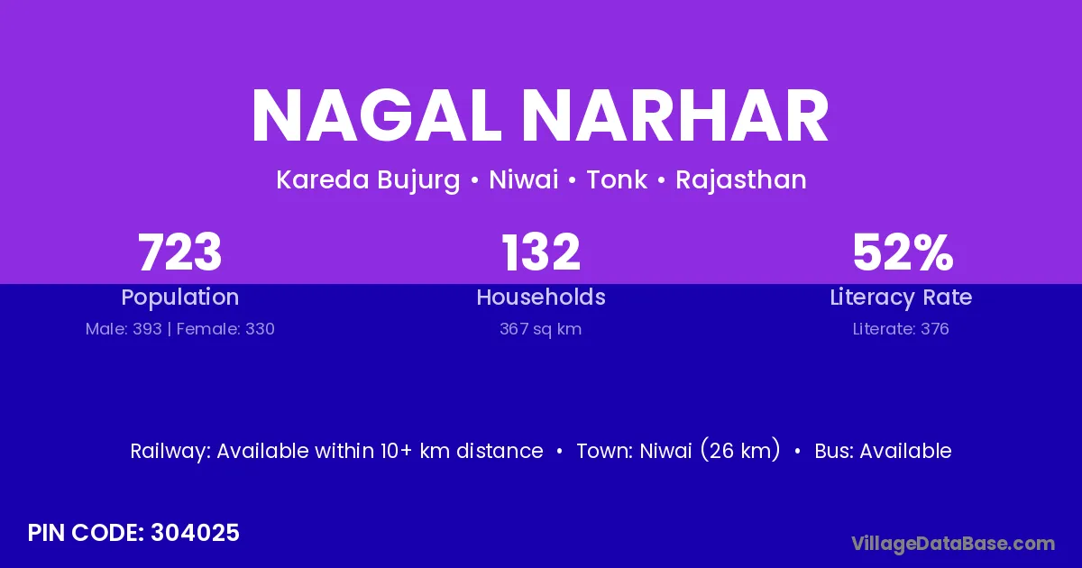 Niwai (26 km) is the nearest town to Nagal Narhar village for major economic activities and is located approximately 26 km away.