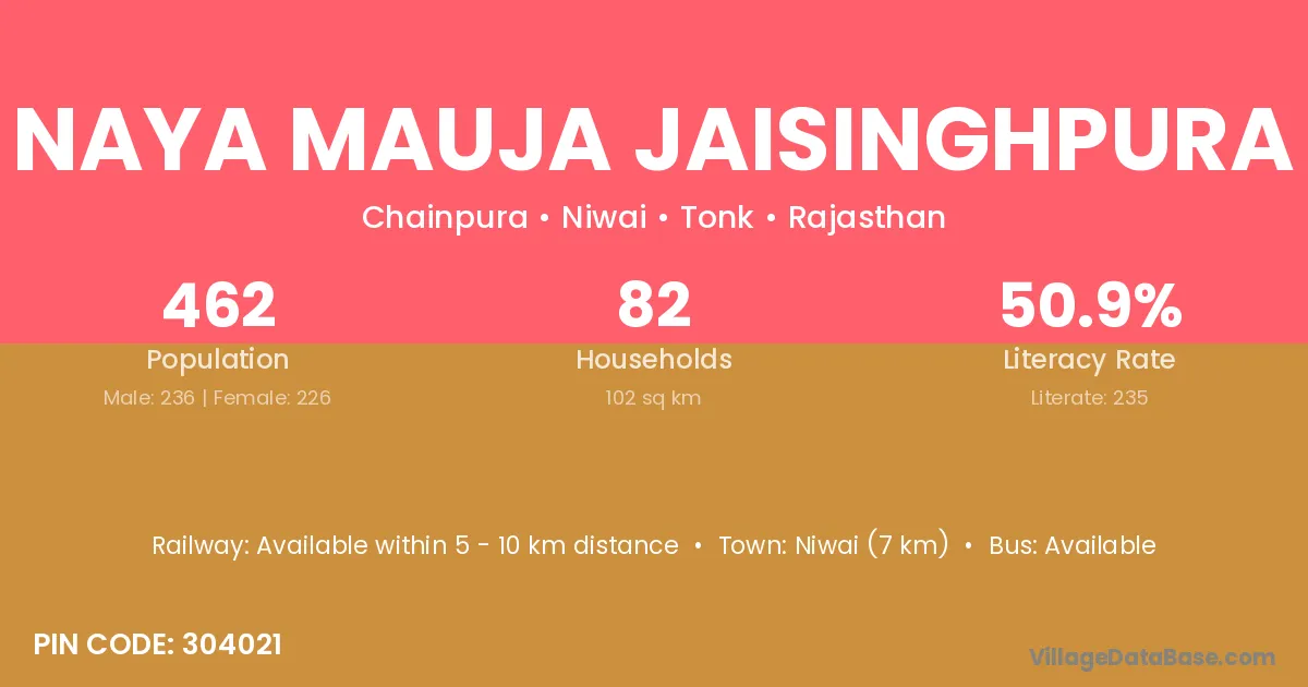 Naya Mauja Jaisinghpura village has a total population of 462 people, of which 236 are males and 226 are females.