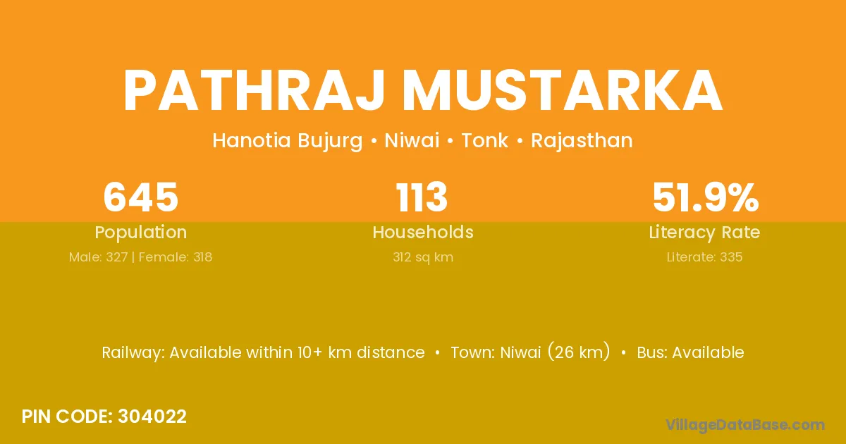 Niwai (26 km) is the nearest town to Pathraj Mustarka village for major economic activities and is located approximately 26 km away.