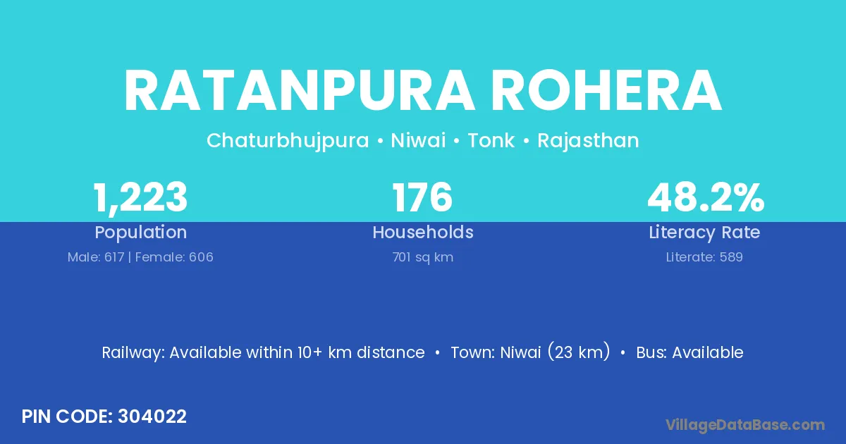 Ratanpura Rohera village has a total population of 1,223 people, of which 617 are males and 606 are females.