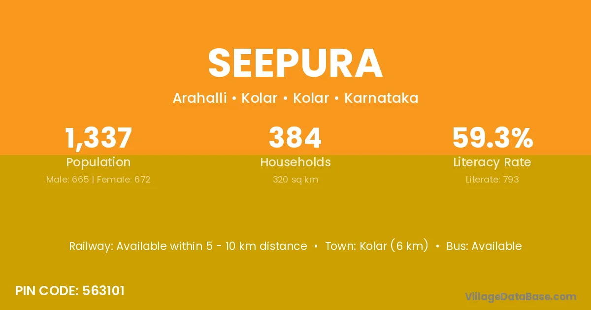 The literacy rate of Seepura village is 48.79%. Male literacy stands at 66.89% and female literacy at 28.99%.
