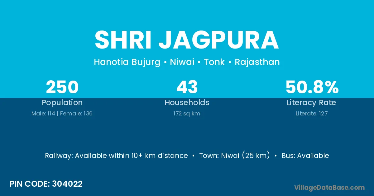 Niwai (25 km) is the nearest town to Shri Jagpura village for major economic activities and is located approximately 25 km away.