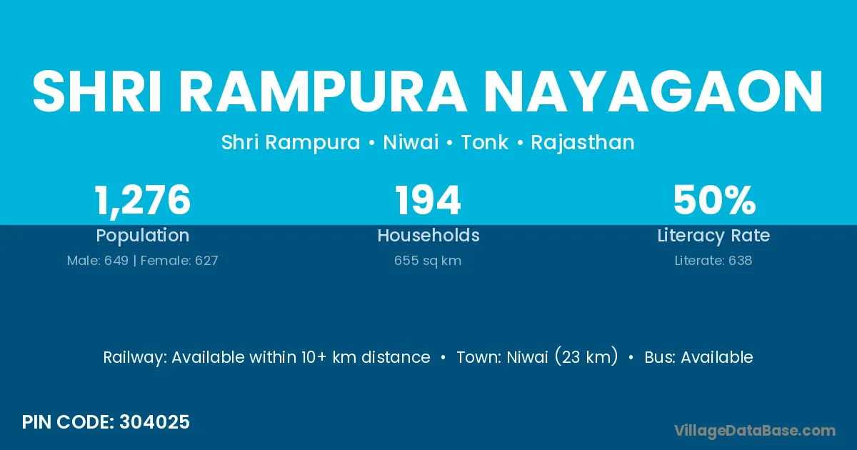 Shri Rampura Nayagaon village has a total population of 1,276 people, of which 649 are males and 627 are females.