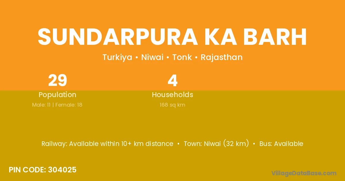 Niwai (32 km) is the nearest town to Sundarpura Ka Barh village for major economic activities and is located approximately 32 km away.