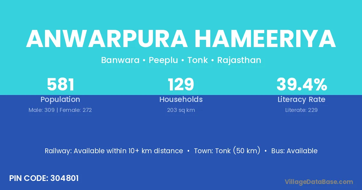 Tonk (50 km) is the nearest town to Anwarpura Hameeriya village for major economic activities and is located approximately 50 km away.