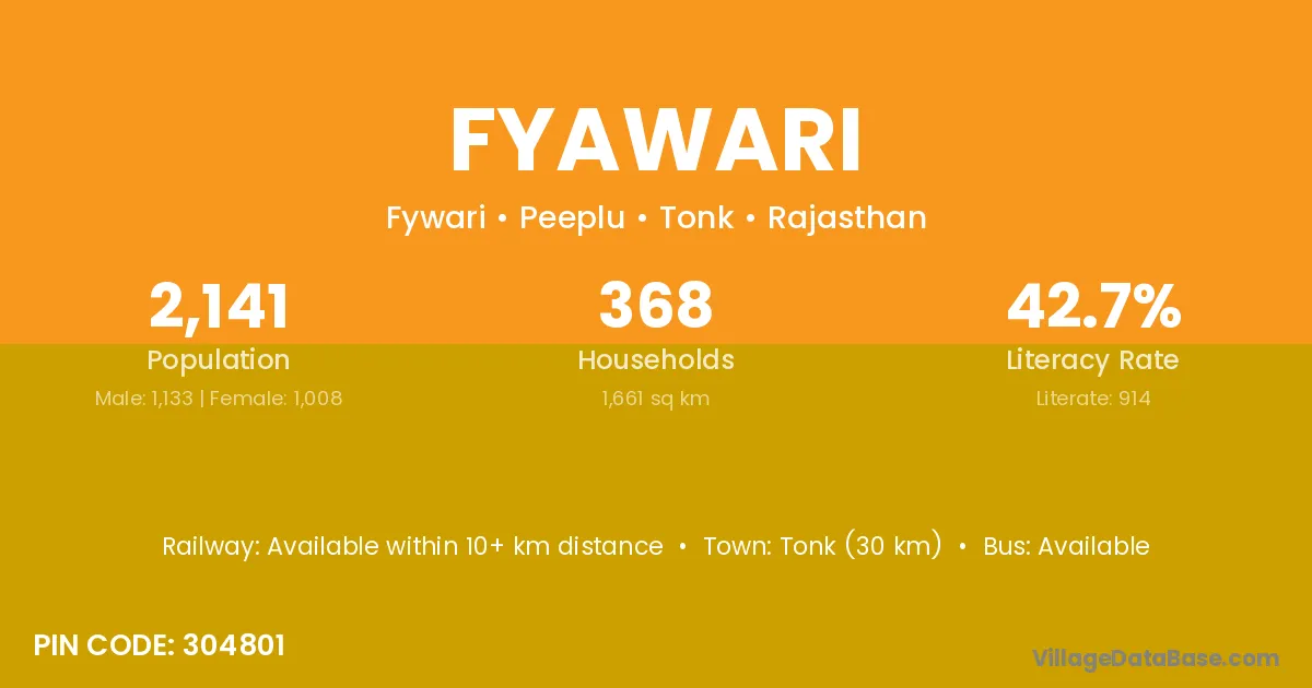 Tonk (30 km) is the nearest town to Fyawari village for major economic activities and is located approximately 30 km away.