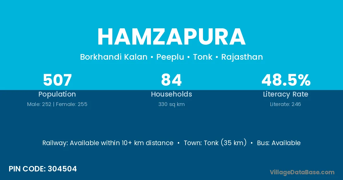 Tonk (35 km) is the nearest town to Hamzapura village for major economic activities and is located approximately 35 km away.