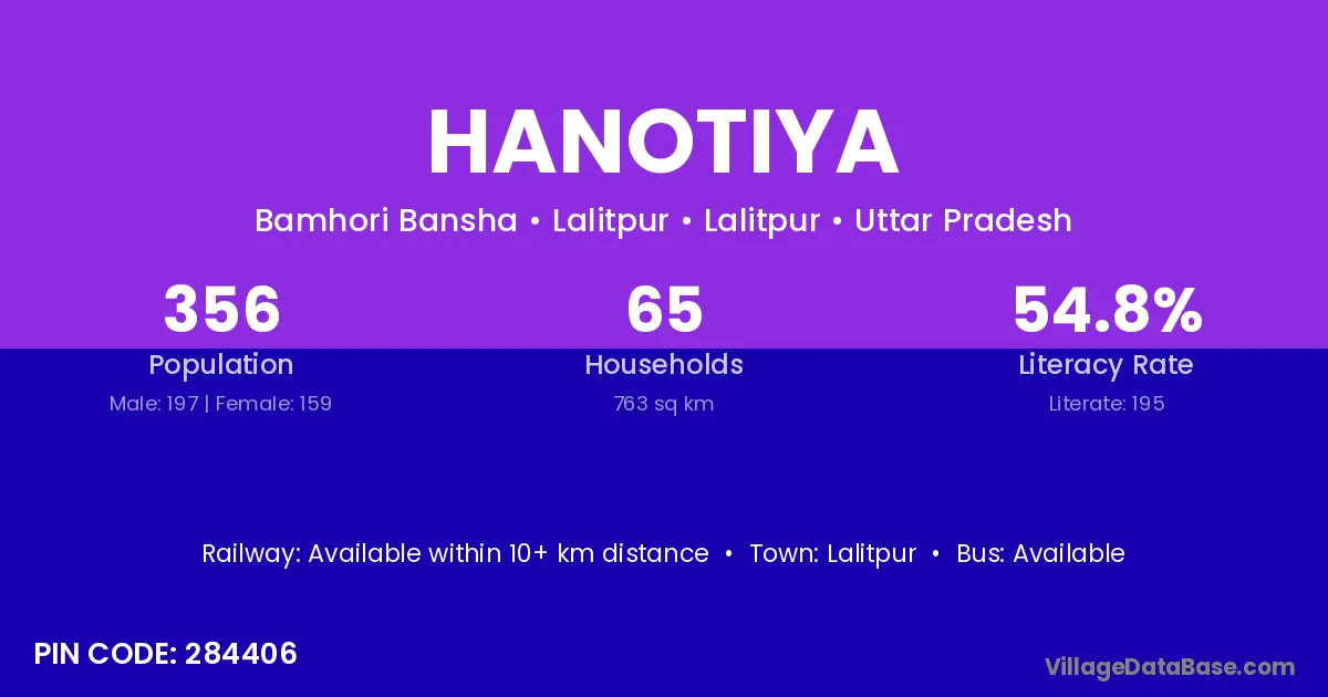 The literacy rate of Hanotiya village is 53.24%. Male literacy stands at 67.60% and female literacy at 38.49%.