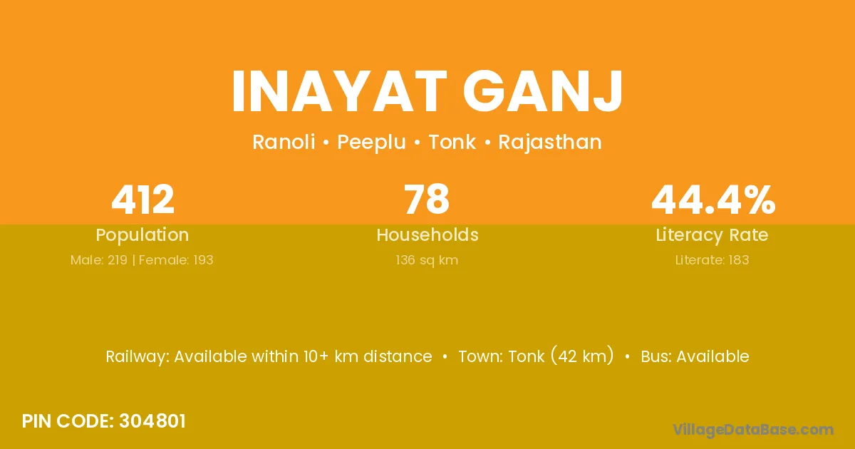 Tonk (42 km) is the nearest town to Inayat Ganj village for major economic activities and is located approximately 42 km away.