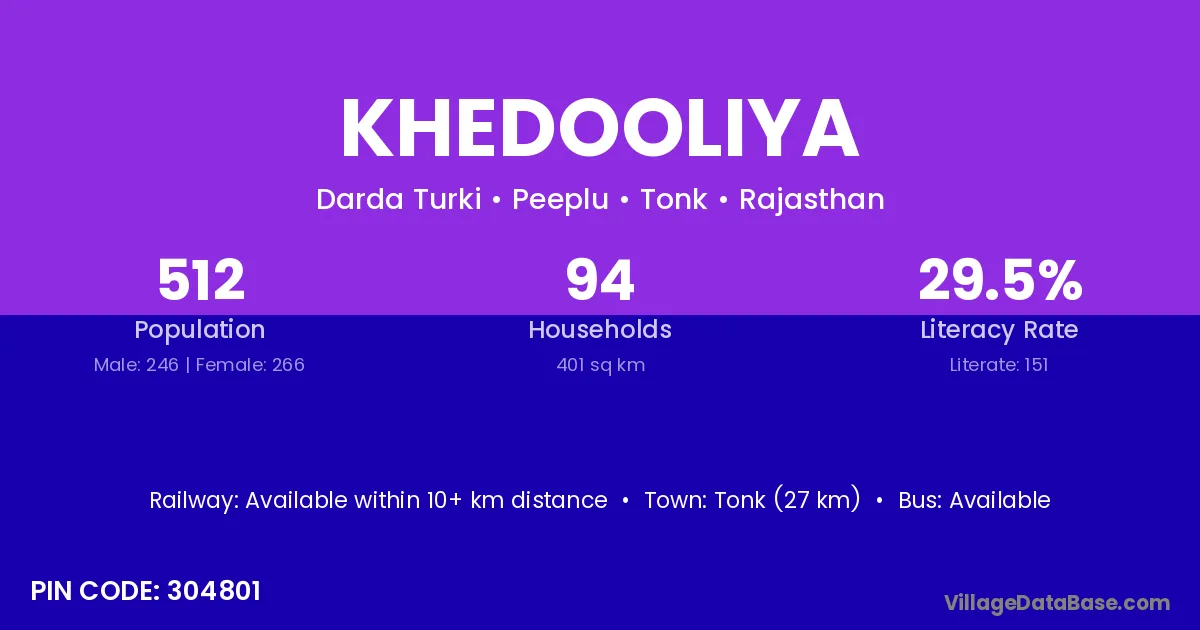 Tonk (27 km) is the nearest town to Khedooliya village for major economic activities and is located approximately 27 km away.