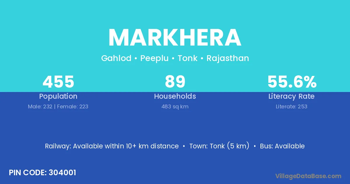 Tonk (5 km) is the nearest town to Markhera village for major economic activities and is located approximately 5 km away.