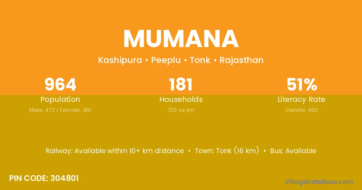 Tonk (16 km) is the nearest town to Mumana village for major economic activities and is located approximately 16 km away.