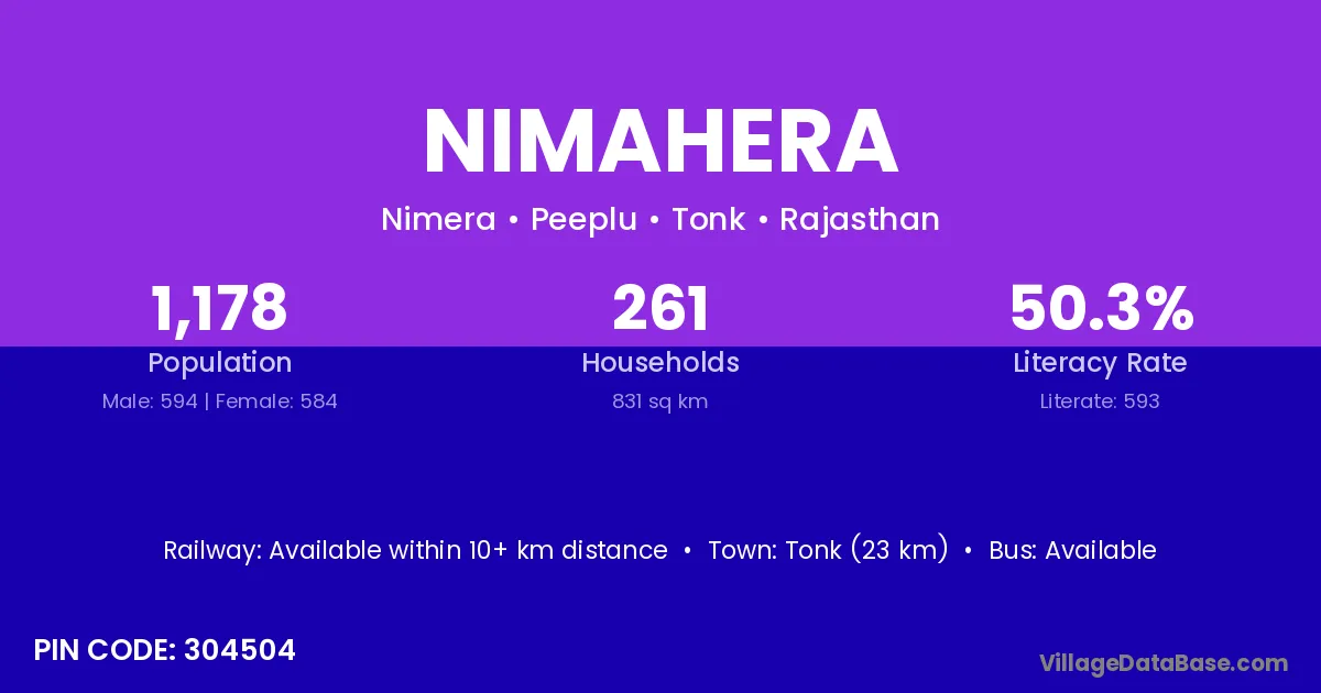 Tonk (23 km) is the nearest town to Nimahera village for major economic activities and is located approximately 23 km away.