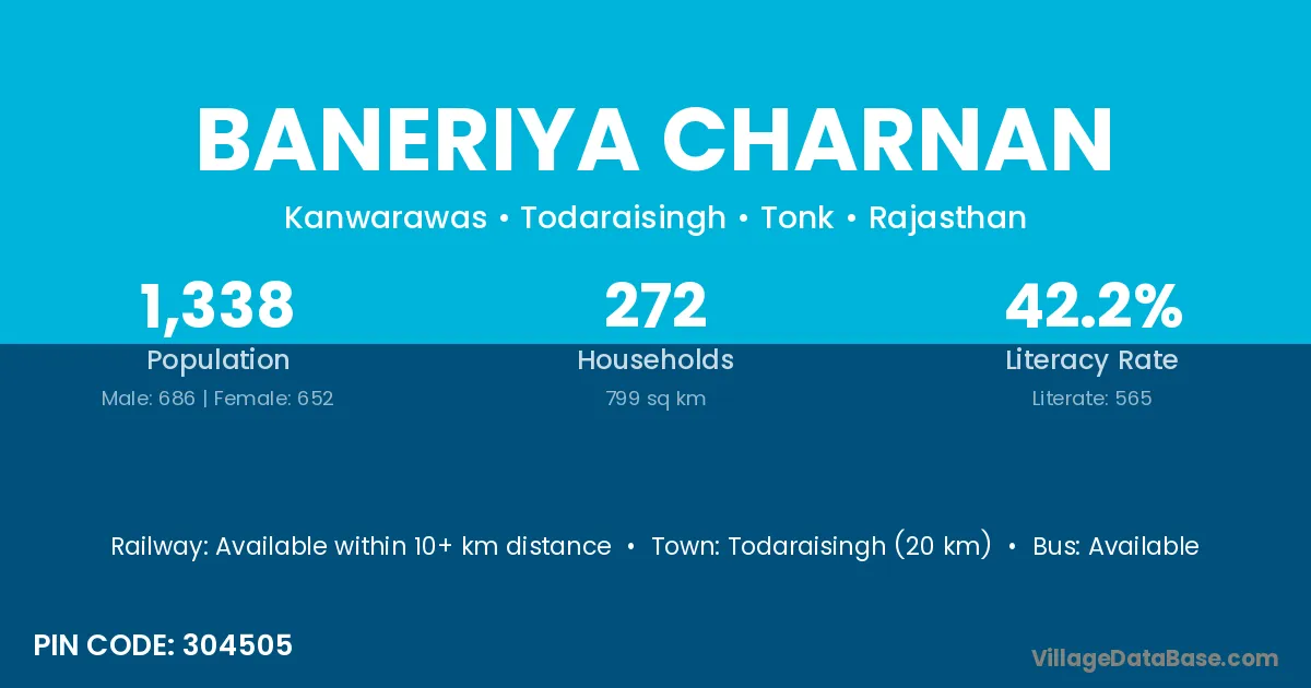 Todaraisingh (20 km) is the nearest town to Baneriya Charnan village for major economic activities and is located approximately 20 km away.