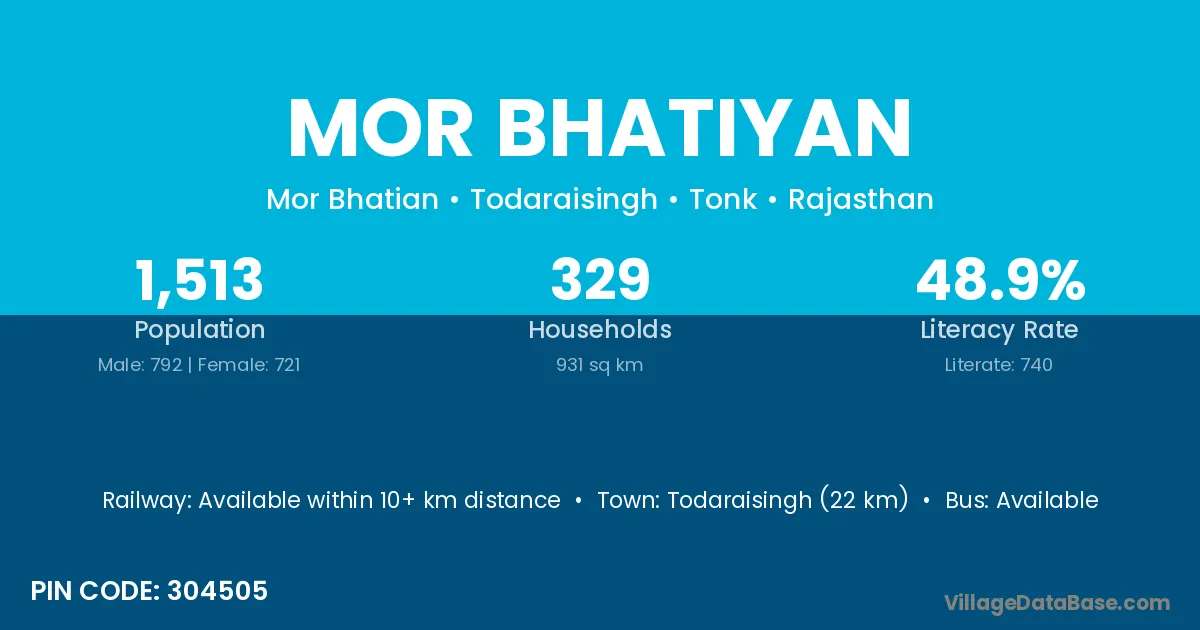 Todaraisingh (22 km) is the nearest town to Mor Bhatiyan village for major economic activities and is located approximately 22 km away.