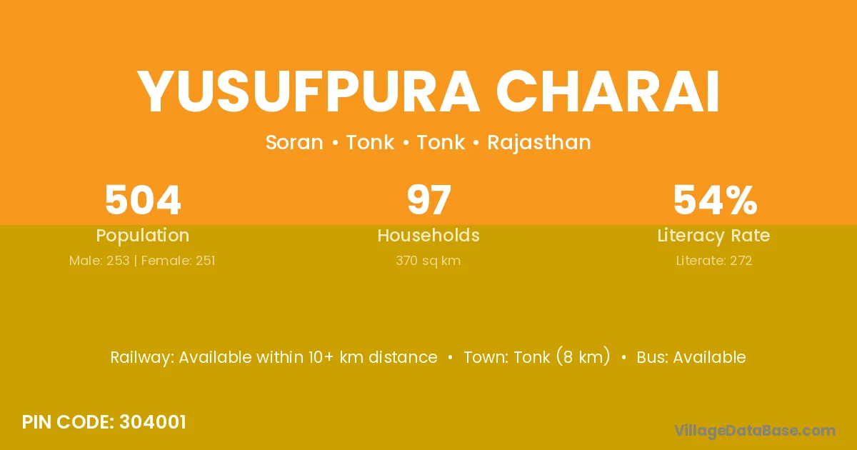 Tonk (8 km) is the nearest town to Yusufpura Charai village for major economic activities and is located approximately 8 km away.