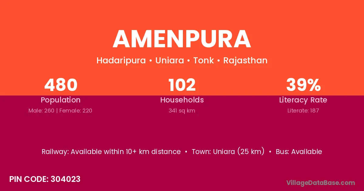 Uniara (25 km) is the nearest town to Amenpura village for major economic activities and is located approximately 25 km away.