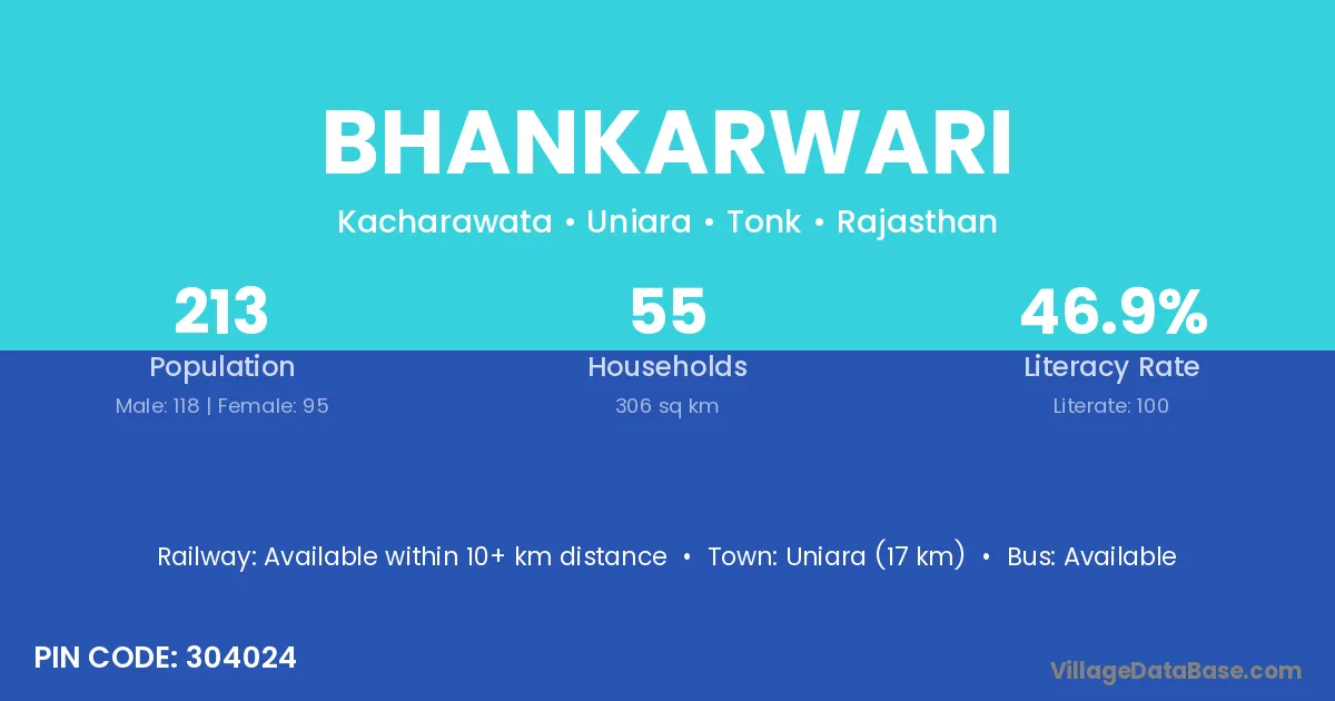 Bhankarwari village has a total population of 213 people, of which 118 are males and 95 are females.