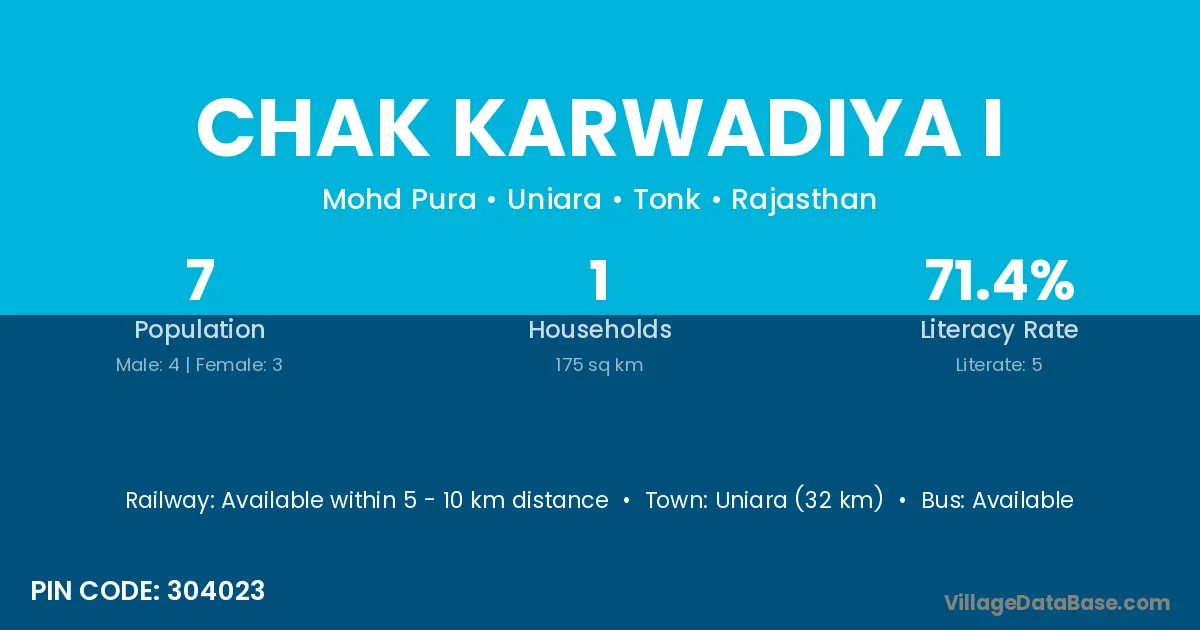 Uniara (32 km) is the nearest town to Chak Karwadiya I village for major economic activities and is located approximately 32 km away.