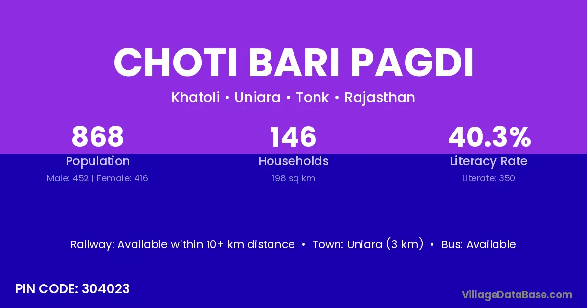 Choti Bari Pagdi village has a total population of 868 people, of which 452 are males and 416 are females.