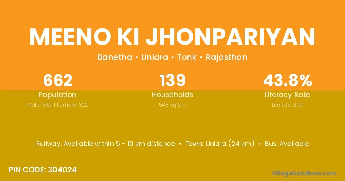Meeno Ki Jhonpariyan village has a total population of 662 people, of which 340 are males and 322 are females.