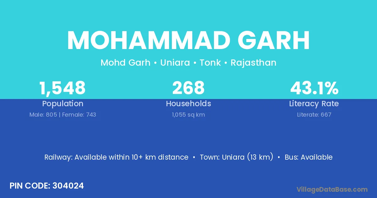 Uniara (13 km) is the nearest town to Mohammad Garh village for major economic activities and is located approximately 13 km away.