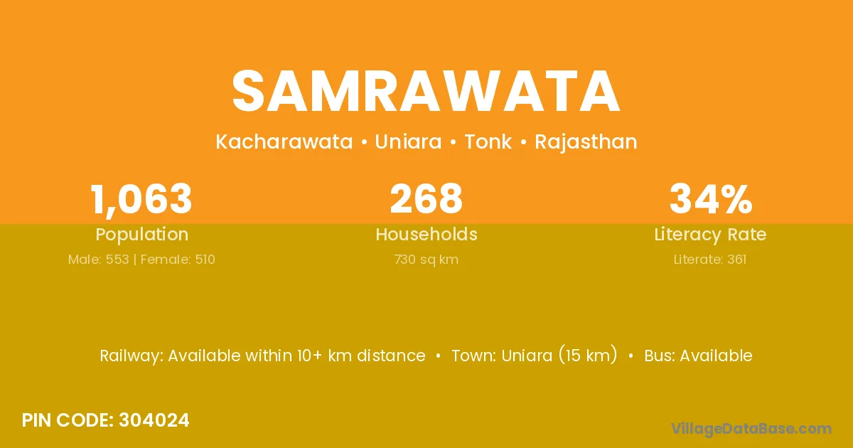 Uniara (15 km) is the nearest town to Samrawata village for major economic activities and is located approximately 15 km away.