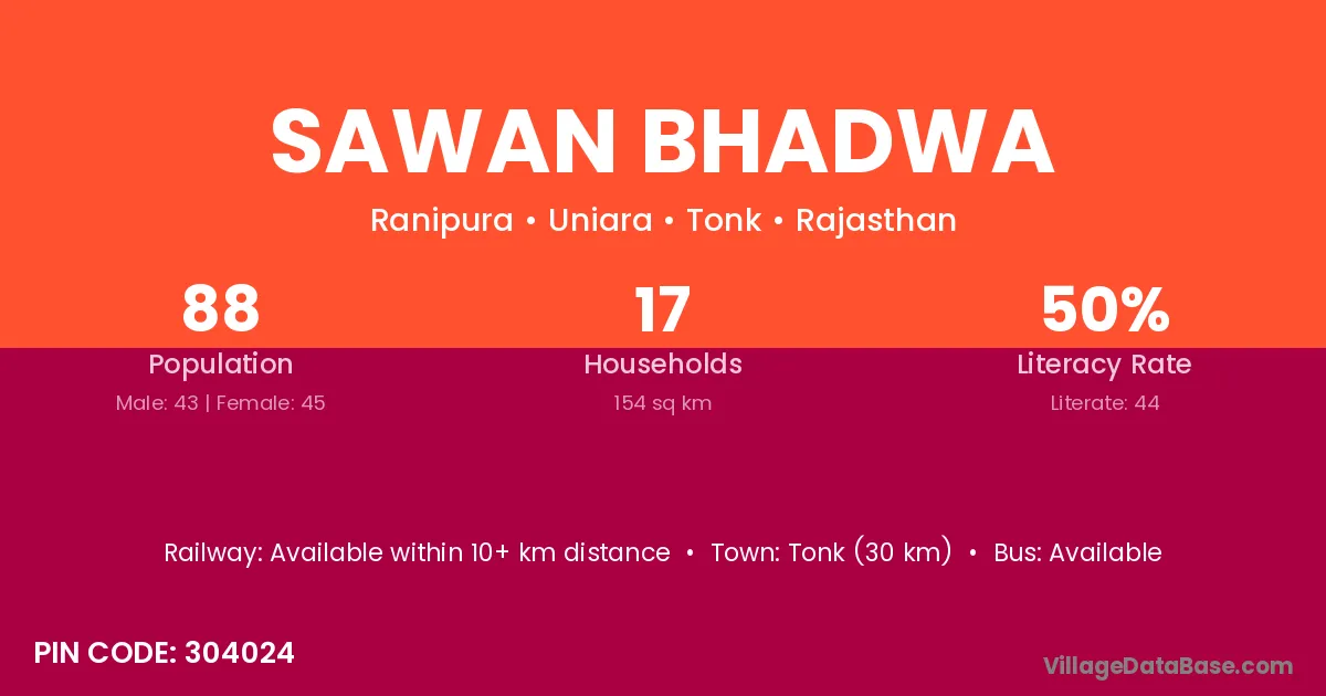 Tonk (30 km) is the nearest town to Sawan Bhadwa village for major economic activities and is located approximately 30 km away.