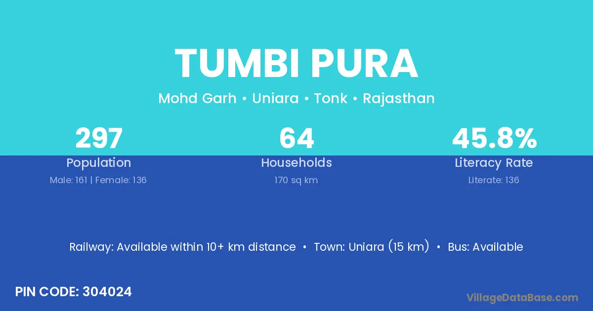 Uniara (15 km) is the nearest town to Tumbi Pura village for major economic activities and is located approximately 15 km away.