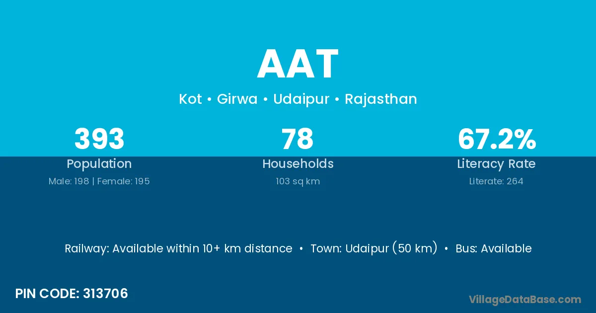 Udaipur (50 km) is the nearest town to Aat village for major economic activities and is located approximately 50 km away.