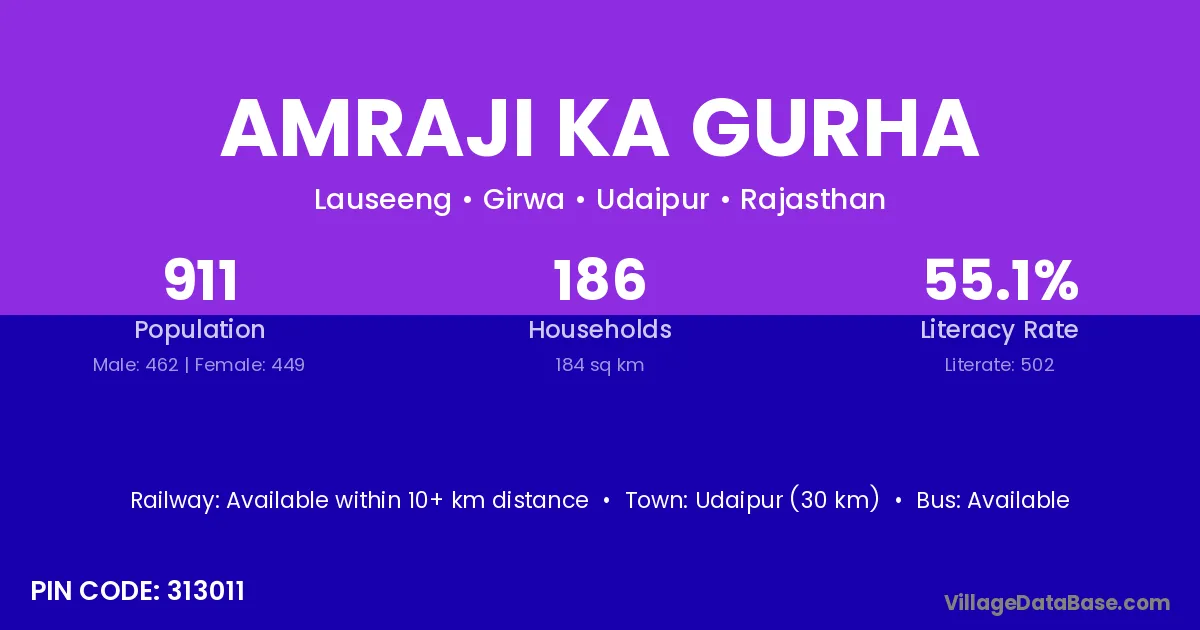 Amraji Ka Gurha village has a total population of 911 people, of which 462 are males and 449 are females.