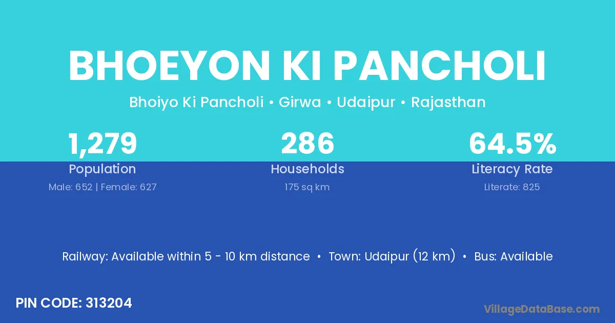 Bhoeyon Ki Pancholi village has a total population of 1,279 people, of which 652 are males and 627 are females.