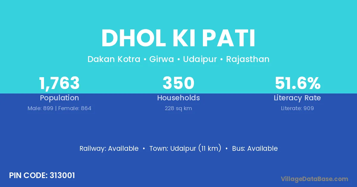 Udaipur (11 km) is the nearest town to Dhol Ki Pati village for major economic activities and is located approximately 11 km away.