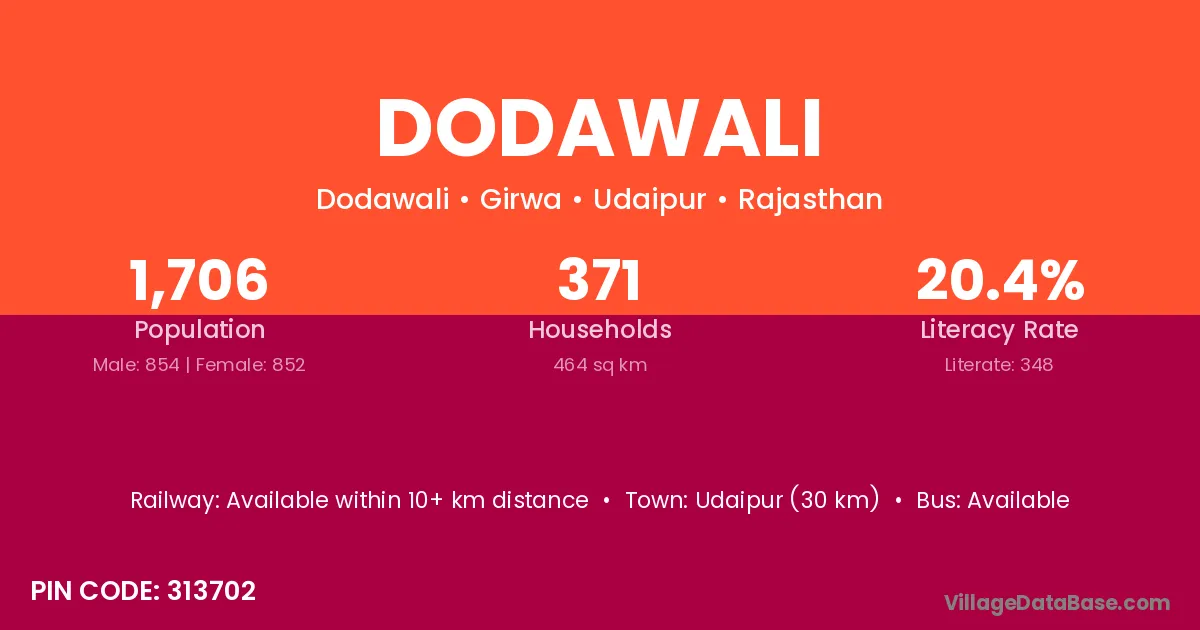 Udaipur (30 km) is the nearest town to Dodawali village for major economic activities and is located approximately 30 km away.