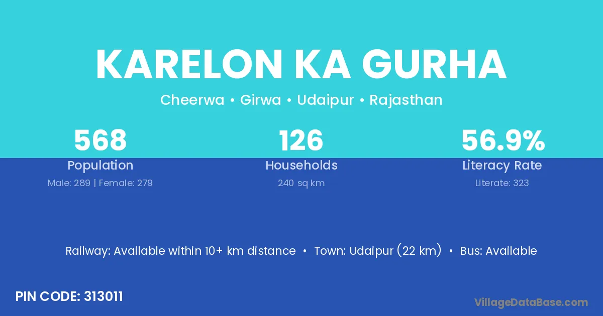 Udaipur (22 km) is the nearest town to Karelon Ka Gurha village for major economic activities and is located approximately 22 km away.