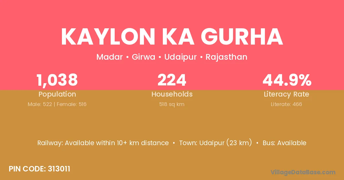 Kaylon Ka Gurha village has a total population of 1,038 people, of which 522 are males and 516 are females.
