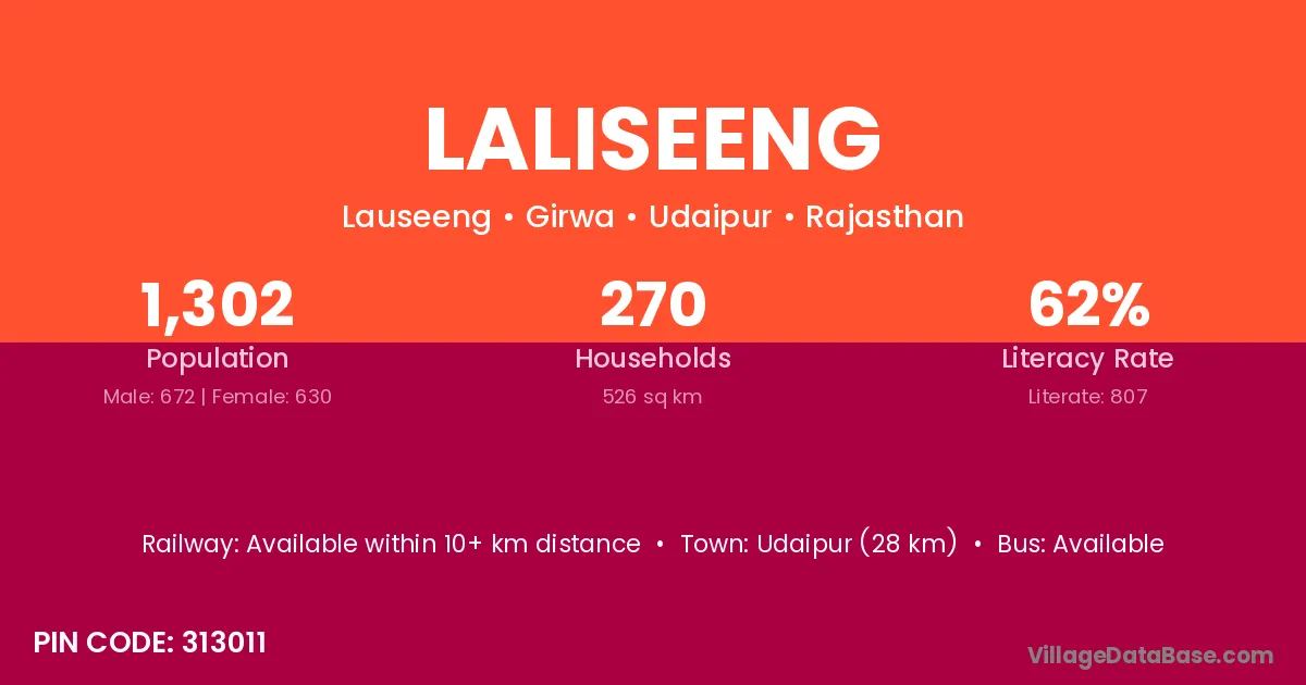 Udaipur (28 km) is the nearest town to Laliseeng village for major economic activities and is located approximately 28 km away.