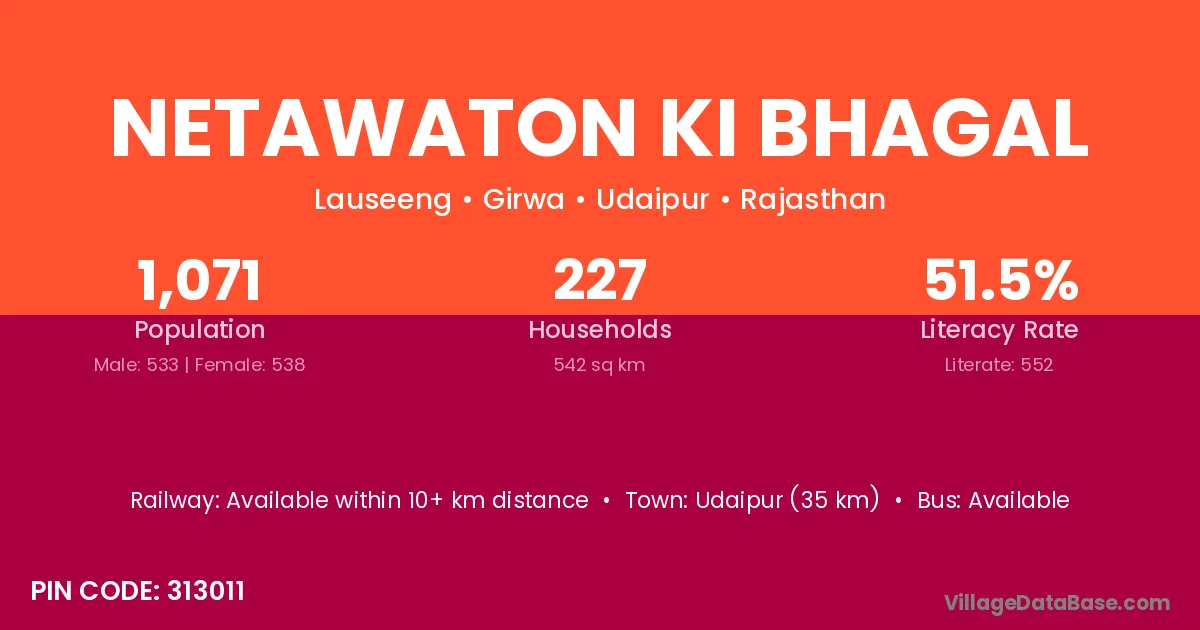 Netawaton Ki Bhagal village has a total population of 1,071 people, of which 533 are males and 538 are females.