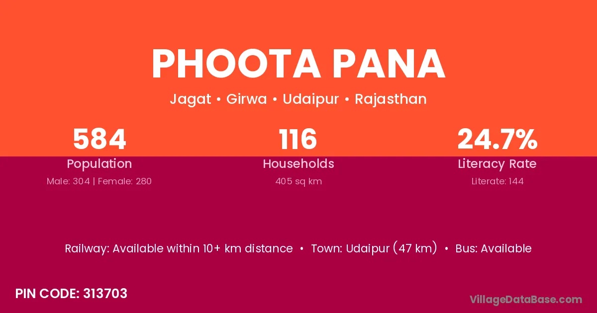 Udaipur (47 km) is the nearest town to Phoota Pana village for major economic activities and is located approximately 47 km away.
