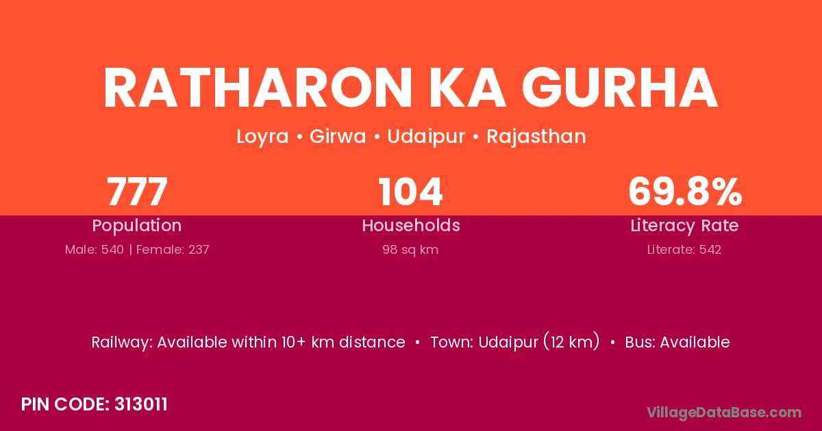 Ratharon Ka Gurha village has a total population of 777 people, of which 540 are males and 237 are females.
