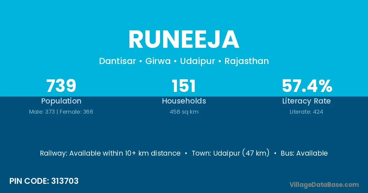 Udaipur (47 km) is the nearest town to Runeeja village for major economic activities and is located approximately 47 km away.