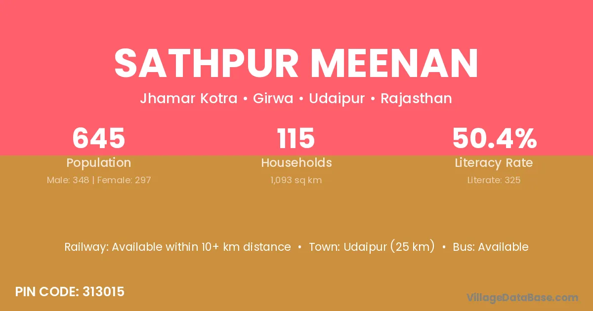Udaipur (25 km) is the nearest town to Sathpur Meenan village for major economic activities and is located approximately 25 km away.