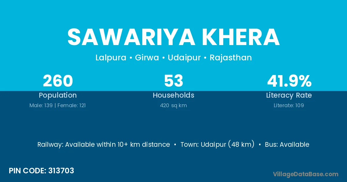 Udaipur (48 km) is the nearest town to Sawariya Khera village for major economic activities and is located approximately 48 km away.